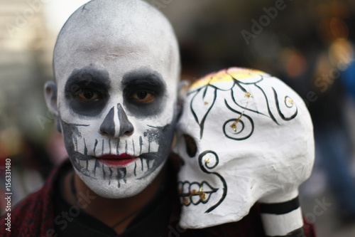 A Man With A Calavera Painted On His Face Takes Part In A Day Of